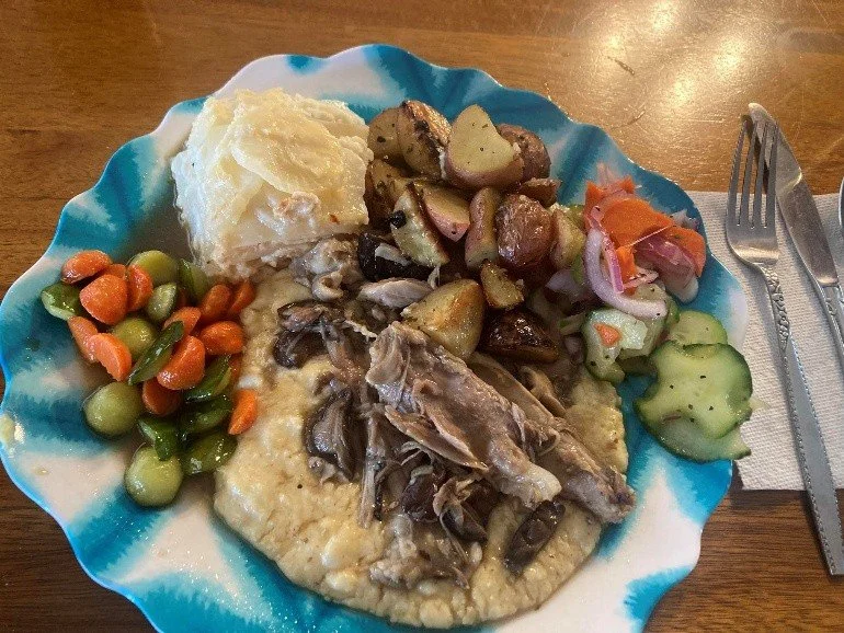 76. Thanksgiving dinner at Granbury planned and cooked (mostly) by our son, Byron, and Cyndi, Katie, Tonya, and Angela: (Bourbon braised pork shank over brie polenta, Parisian glazed carrot and cucumber salad, Dauphinoise (radish au gratin), Rosemary roasted potatoes, and remnant salad, followed with four different pies, extra-rich pecan bars, and ice cream).